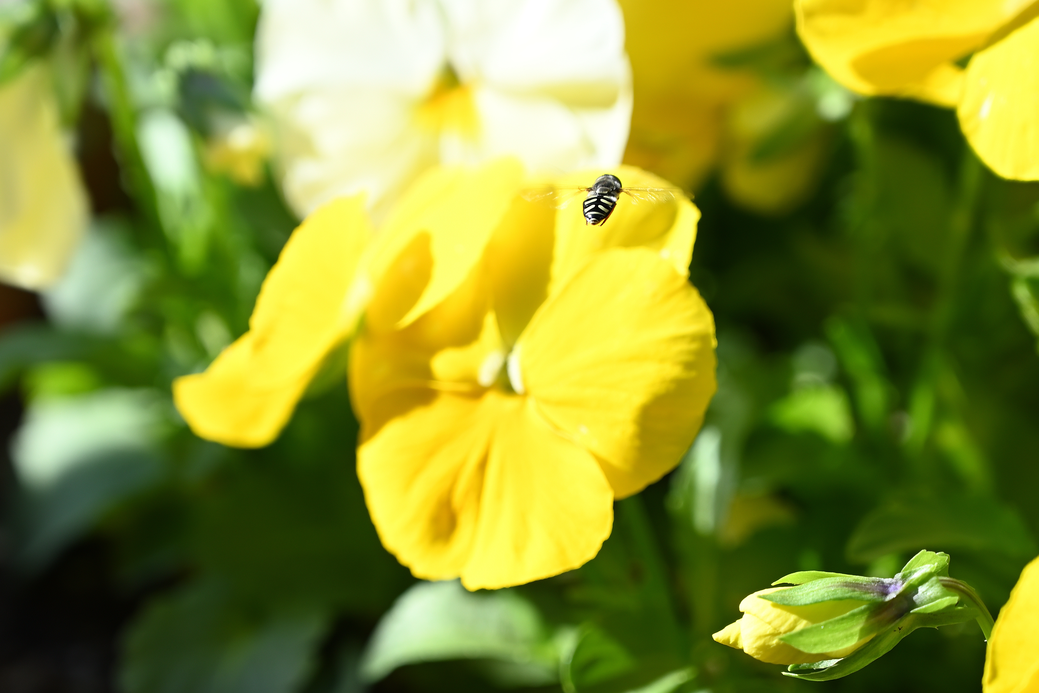 A striped fly flying over a yellow pansy. The stripes on the fly normally look white, but they are partially translucent. So in this photo they look yellow because of the yellow pansy underneath it.