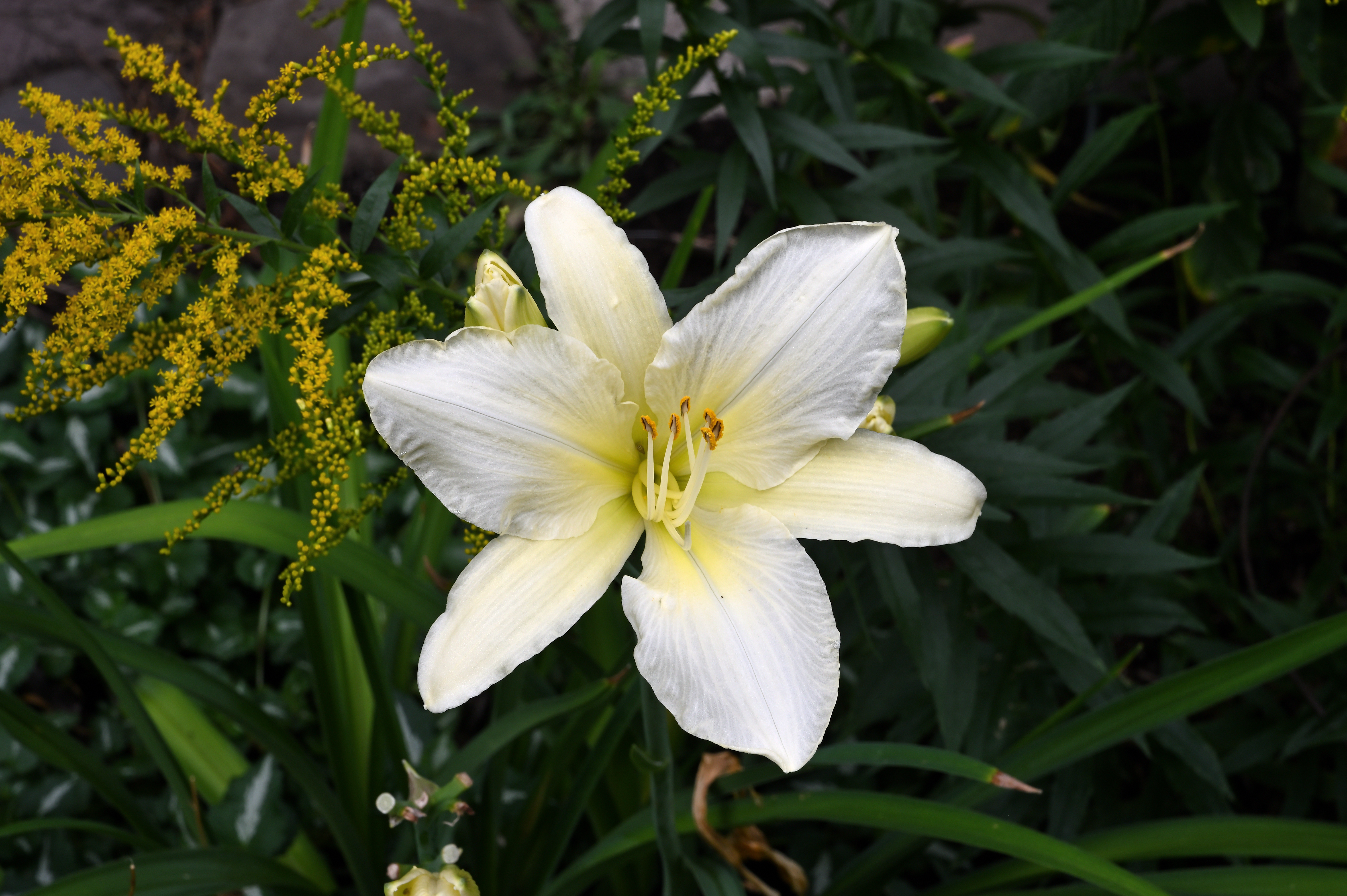 Photo of a white day lily. There is some kind of small creature nestled deep inside the flower. It looks like it might be a moth.