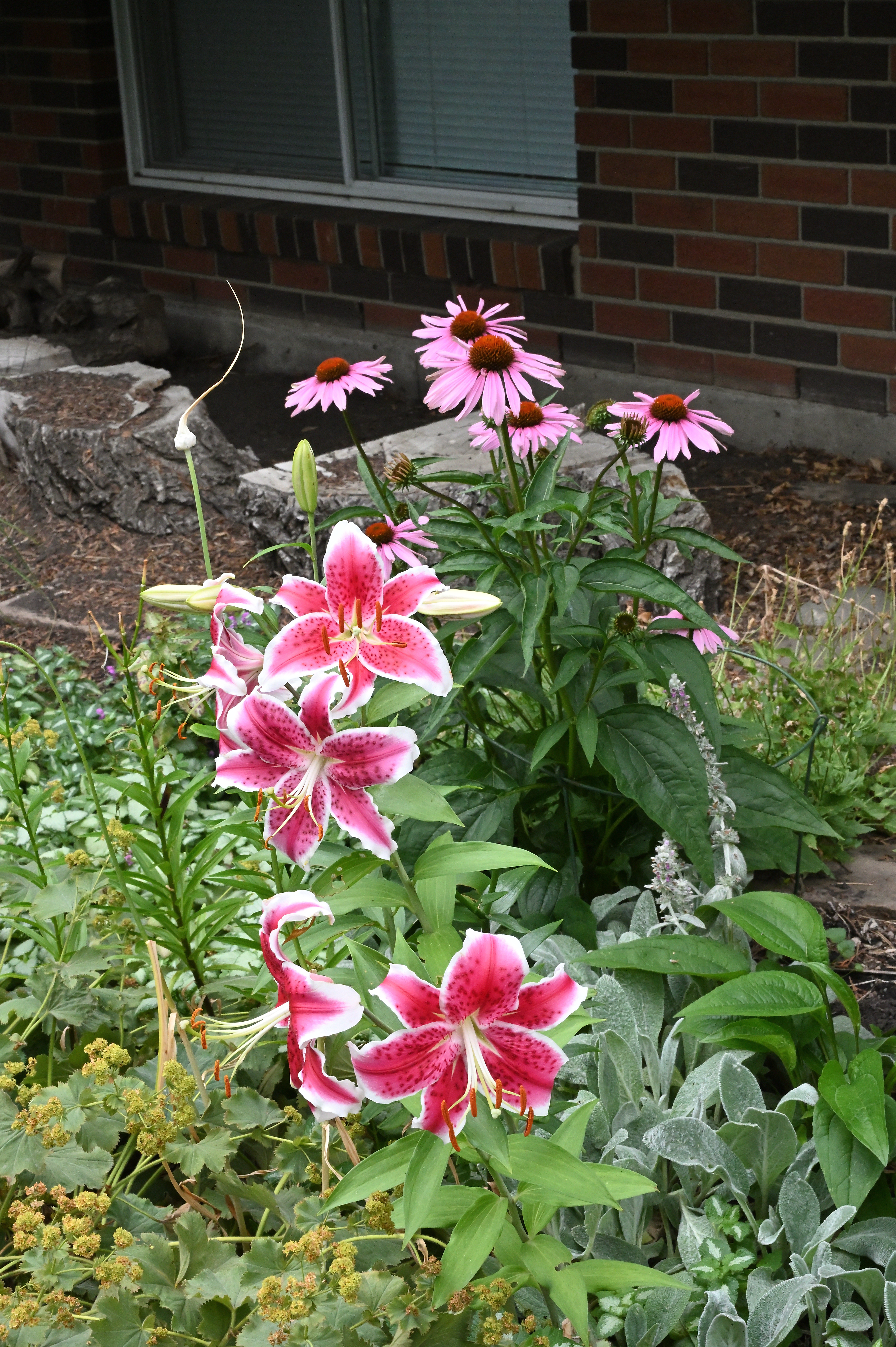 A photo of some Stargazer Lilies and Echinacea growing in front of the house