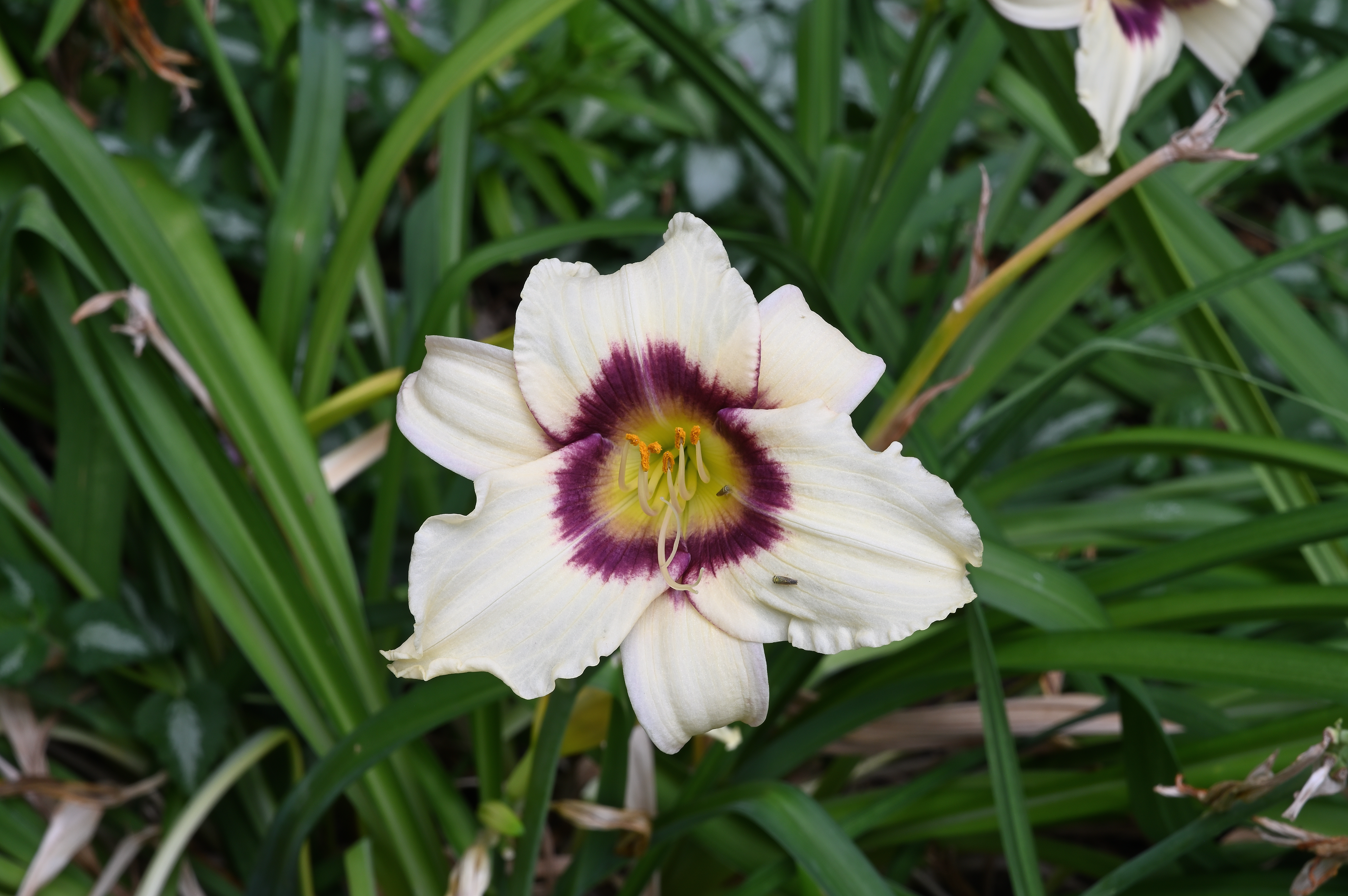 A white day lily with a violet band. There are also two creatures that look like small moths sitting on the flower.