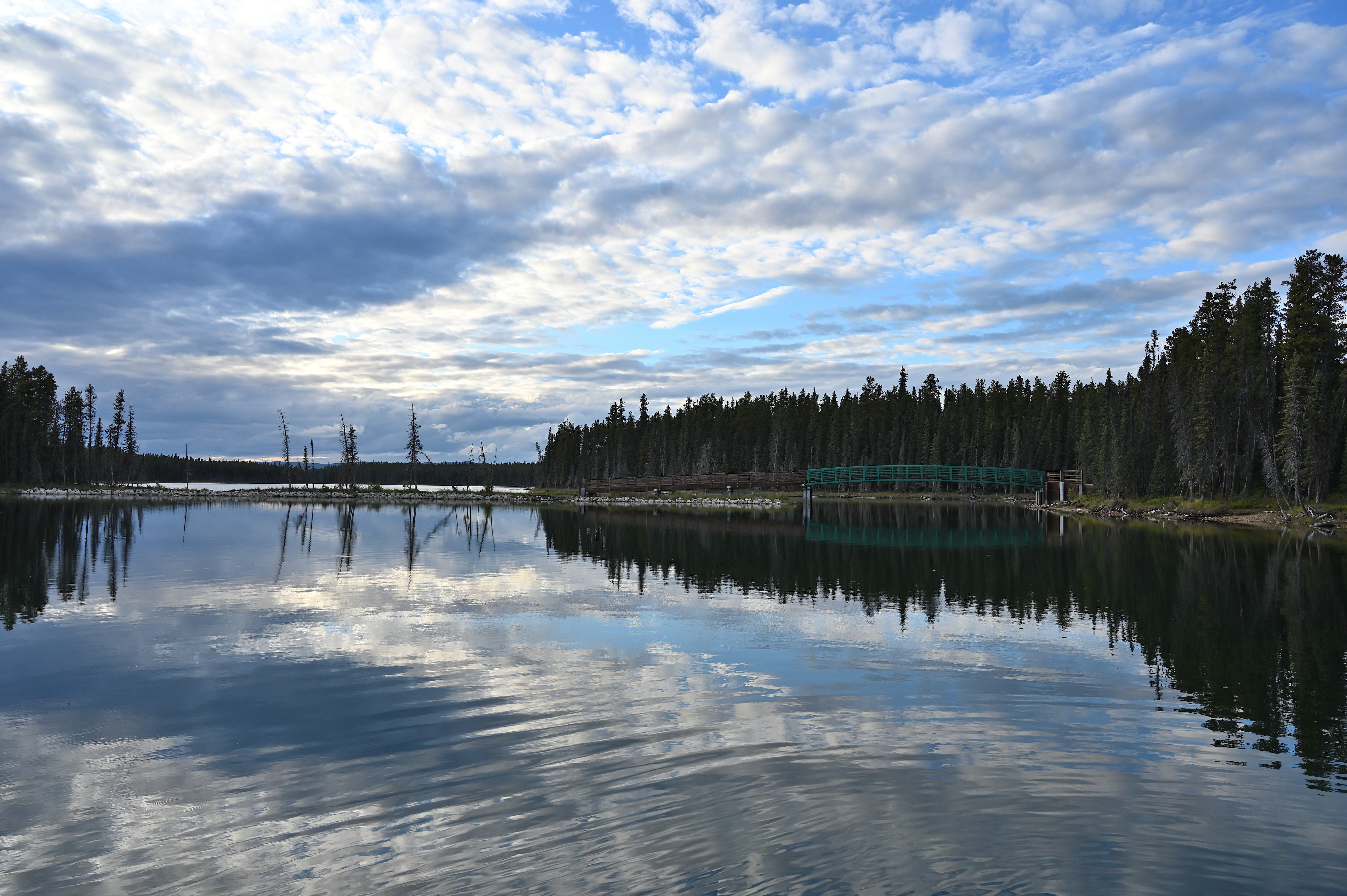 This is a view of Desjarlais Lake from the boat launch. Across the near part of the lake is the bridge and a narrow causeway to the small island in the middle of the lake.