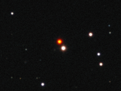 In the cropped image shown here, T Draconis is the deep red star near the center. UY Draconis is the white star to the lower right of T Draconis. The close proximity of these two stars in this image is just a chance alignment, this is not a double star system.