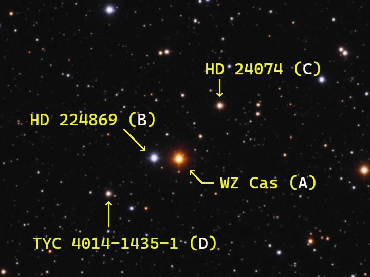The D component, TYC 4014-1435-1, is a also member of the WZ Cas system and it is located to the lower left of HD 2248695.