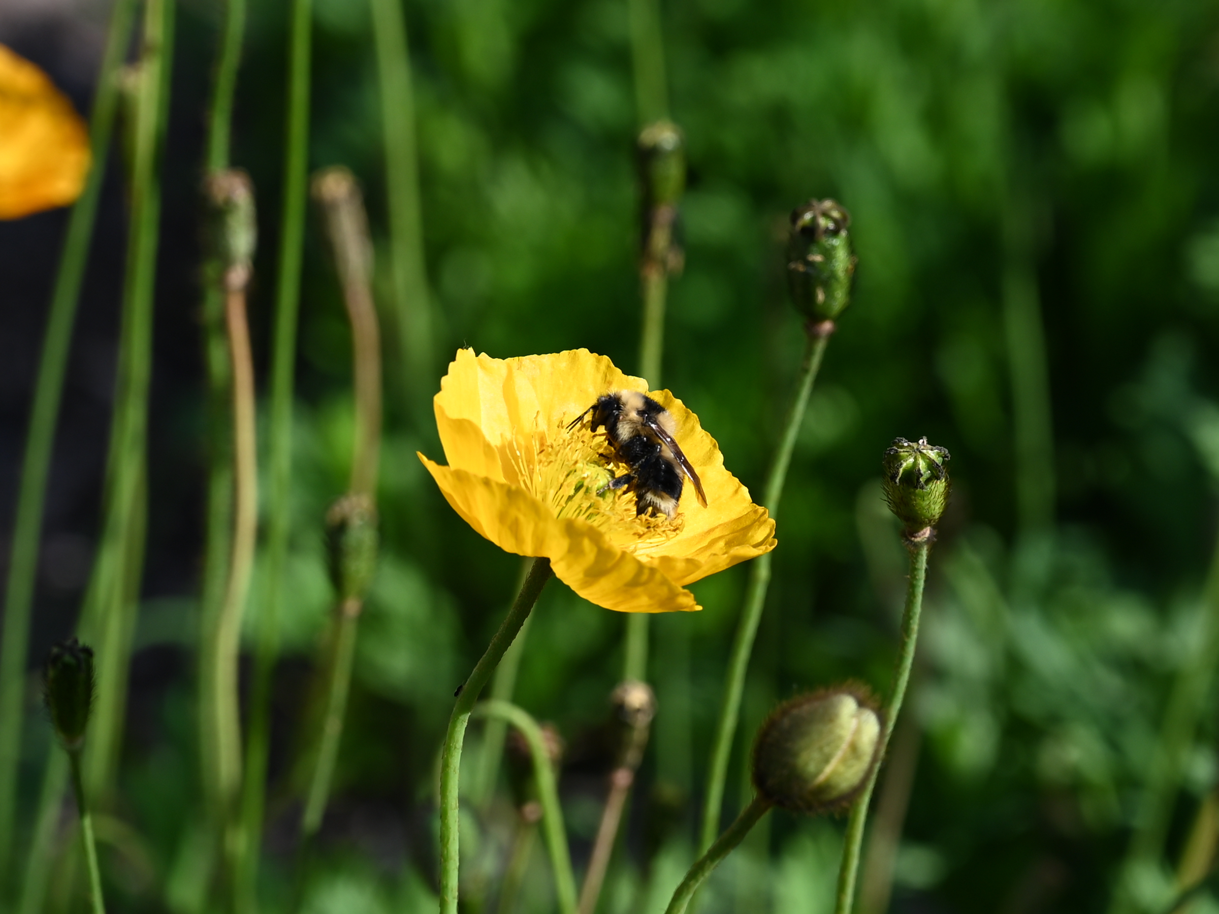 A photo of a bee working on one of the poppies in the back garden
