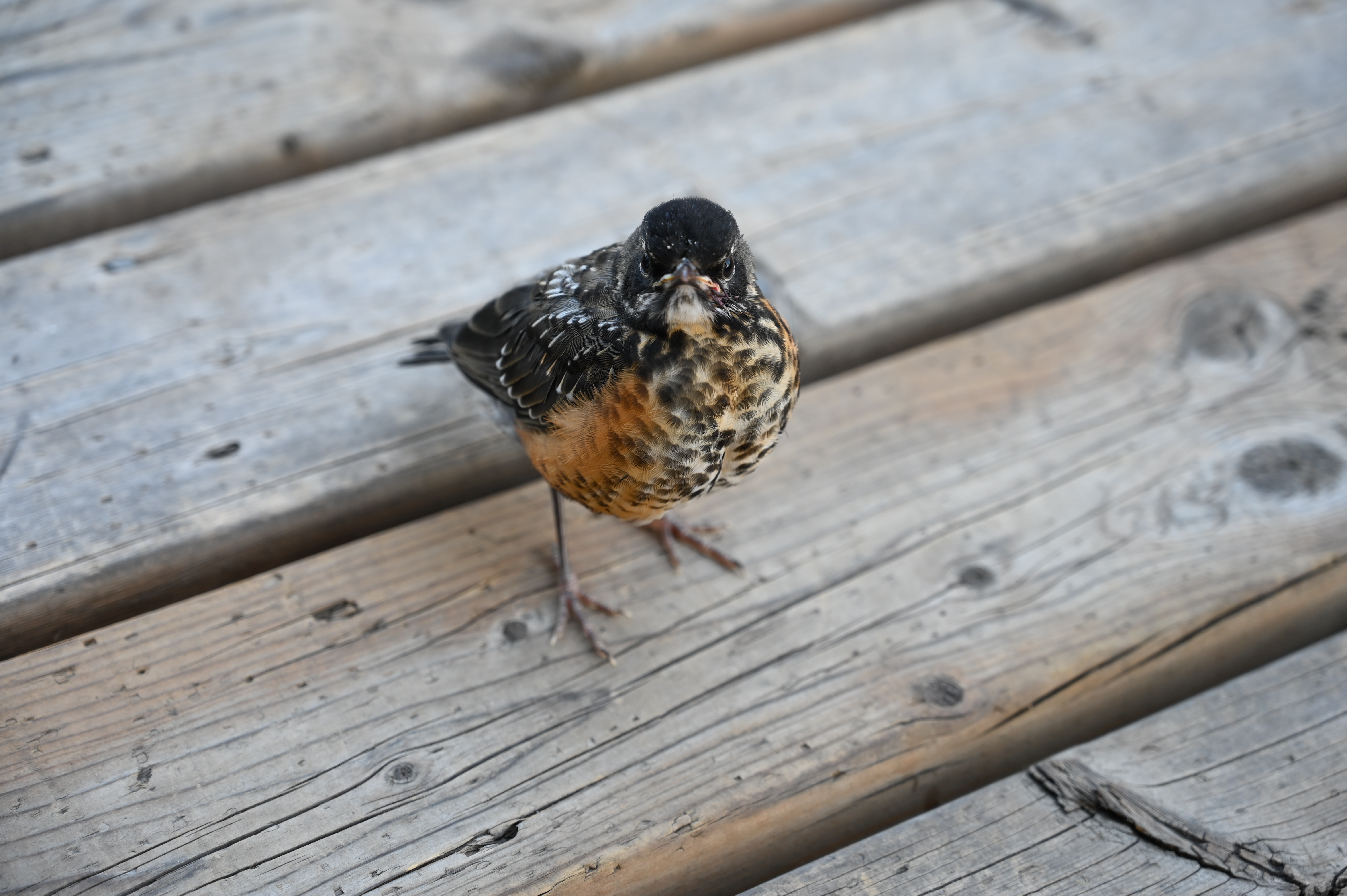 A baby robin on the wooden walkway. The robin was fearless and was looking to make friends. So it hung out with our party including the dog for a while.