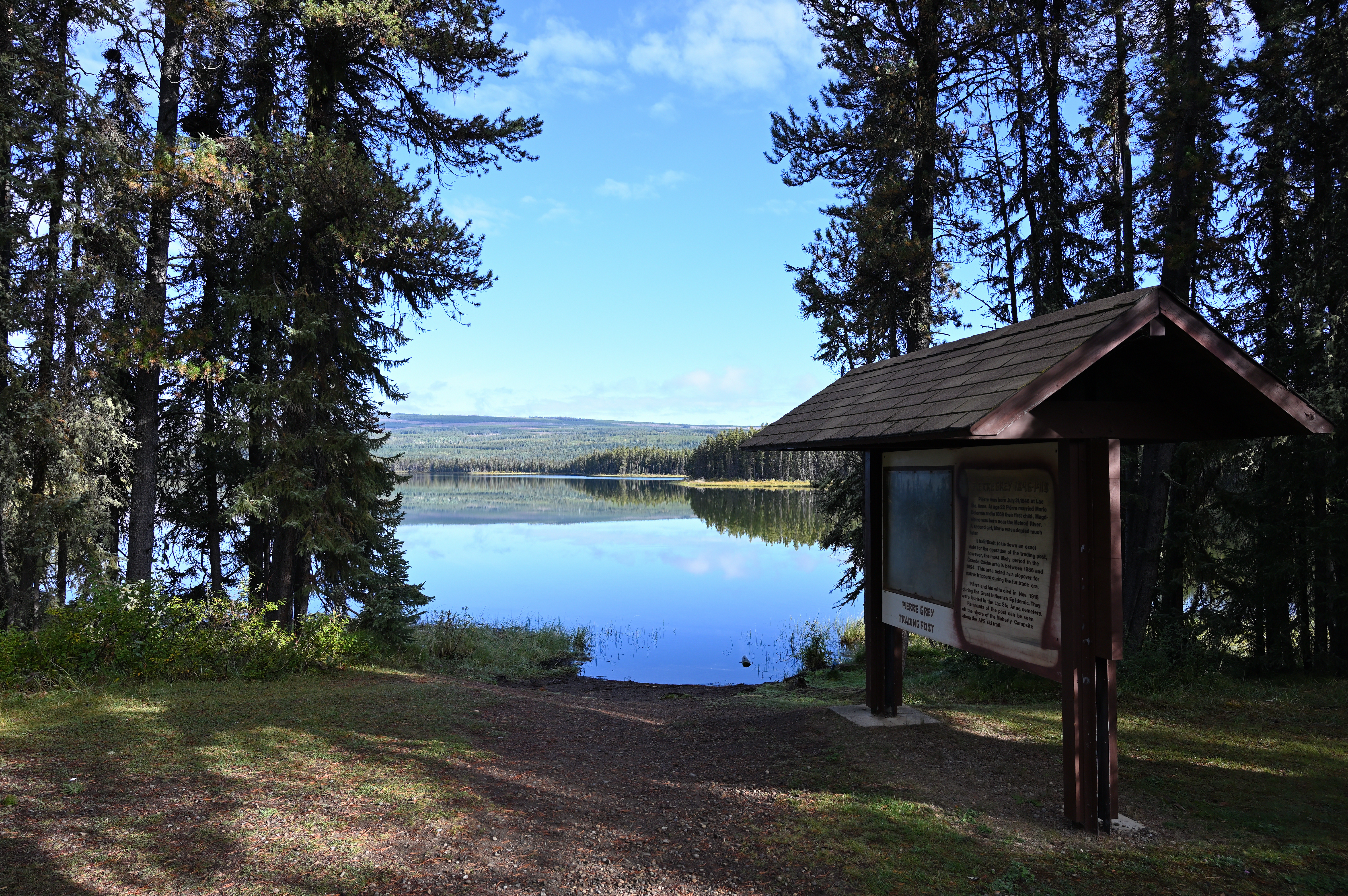 This is a photo of a sign on the opposite side of the lake where Pierre Grey's trading post once stood. The post was built and occupied by Pierre and Marie Grey between 1886 and 1894.